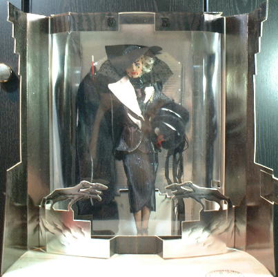 | ディズニー・アニメ“101匹ワンちゃん”に出てくる悪女“クルエラデビル” (ダルメシアンの皮で服を作りたいと言ったとんでもない女!)のBarbie 映画そのままのえらの張ったきつそうなお顔にミューグレーばりのスーツ フェイクファーのマフとストール、赤いサングラスと小物まで凝っている所が嬉しい! |