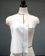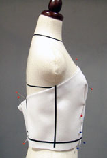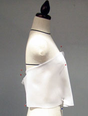 バストの一番高い所に、横にピンを通してバスト・ポイントを決め ウエストの浮き分をゆとりを残してピンで止め、ダーツを作ります 通常バストダーツは直線にしますが バストを強調したシルエットにしたい時は、アンダー・バスト位置で少しつまんで、カーブを作ります |
