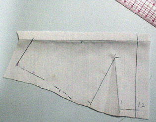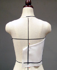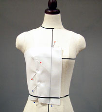 バスト・ポイント、ウエストのダーツ位置に印を付けてから 布を外します (テープはダーツ位置で切る) テープに合わせて線を書き込み、外します (生地が不足した部分は、不足寸法が分かるように) 軽くアイロンを掛け、折り目を伸ばします |
