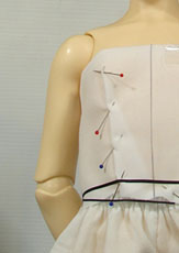 | 出来上がったら、念の為ドルフィーちゃんに着せてみます。 (前後の中心は、テープで止めてあります) トルソーは真っ直ぐな姿勢ですが SDは極端に後ろに反った体型なので、前身頃が後ろ側に引かれてしまい 後ろのウエストラインが下がっているので、SDに合わせて修正します。 ![]() ![]() ![]() 太いラインがトルソーで決めたウエストライン、細い線が修正線です 後ろ中心ではウエスト寸法が少し足りなくなっています |