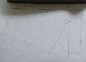 生地のシワをアイロンで良く伸ばして、縦地の目に沿って、 前中心線、垂直に上端線を書き込みます (生地の大きさ 縦16cm×横10.5cm) |