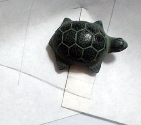 トレーシング・ペーパー、ハトロン紙などを乗せ パターンを写します (前中心、上端線は先に書き込んでおくと良いです) 書き写す時、ずれないように重石・プッシュピンなどで押さえます (ここではテープ・カット台で押さえてあります) |