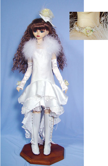 ドレスのサテンの上に、イエローの造花・マラボーを乗せたリボンです