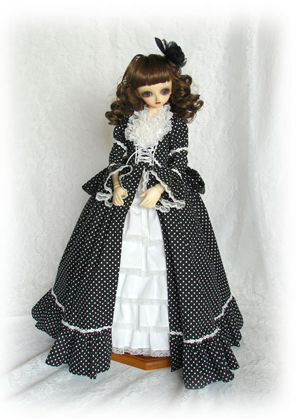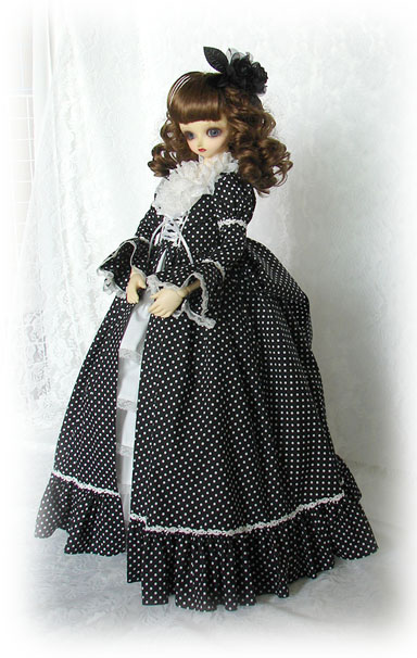黒地に白のドットプリントの綿ブロード・ドレスと